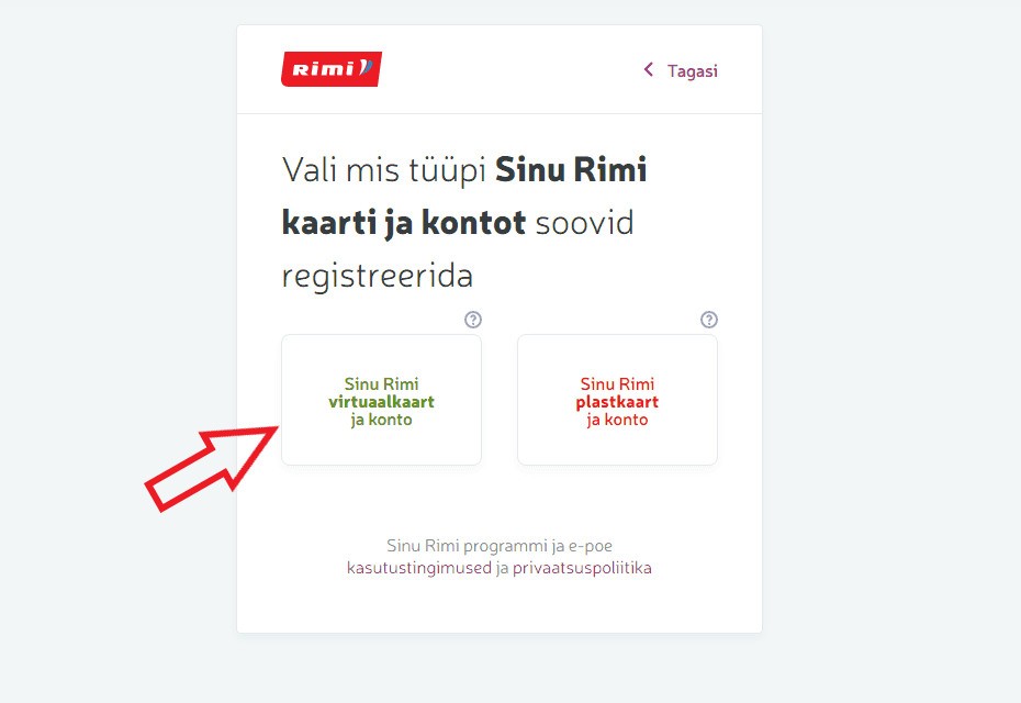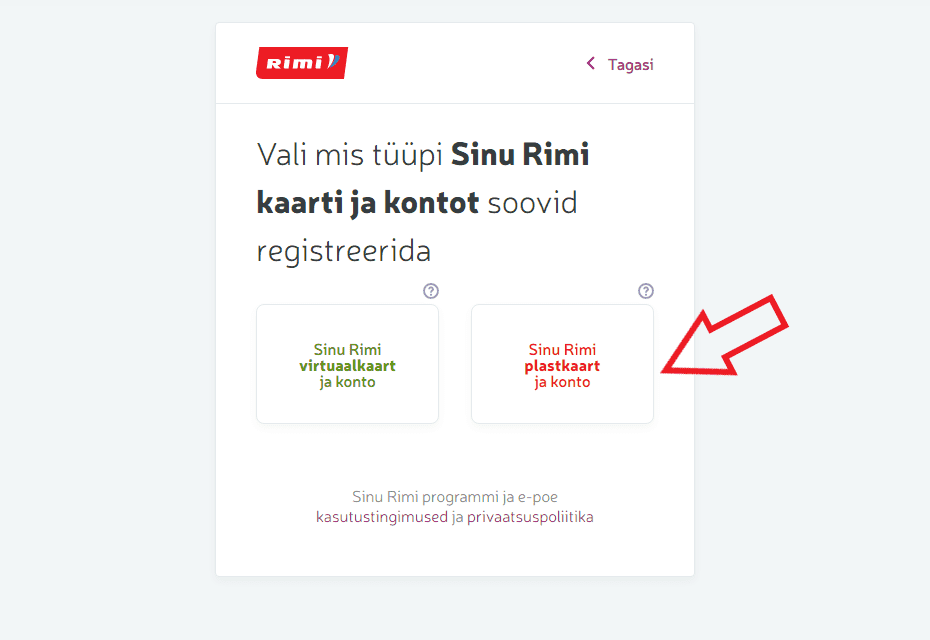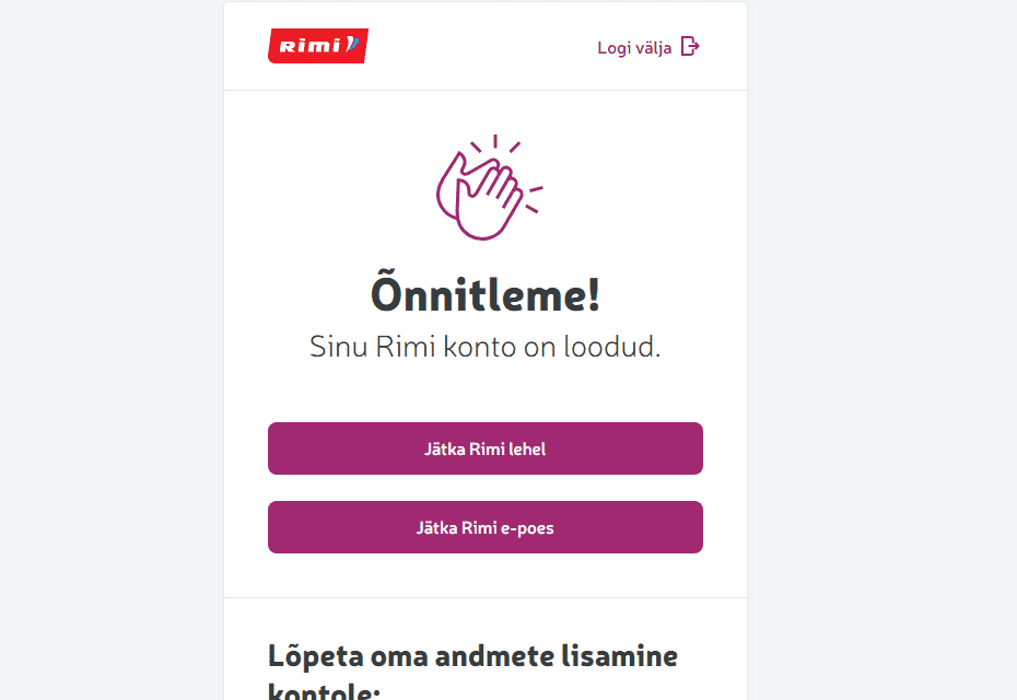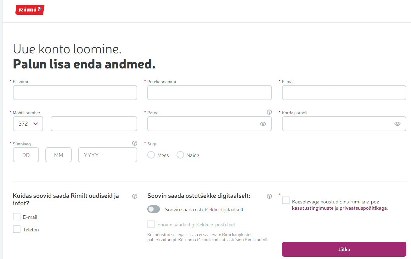 8. Samuti on vajalik konto loomiseks, et nõustud Rimi kasutustingimuste ja privaatsuspoliitikaga. Tingimustega saad täpsemalt tutvuda vajutades lillale tekstile kasti juures.
