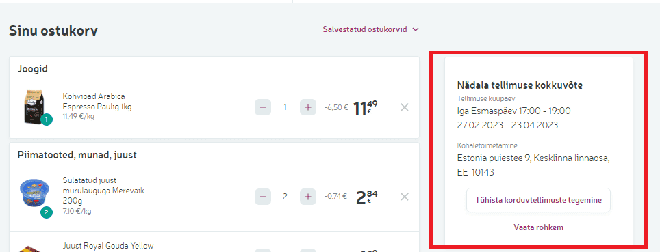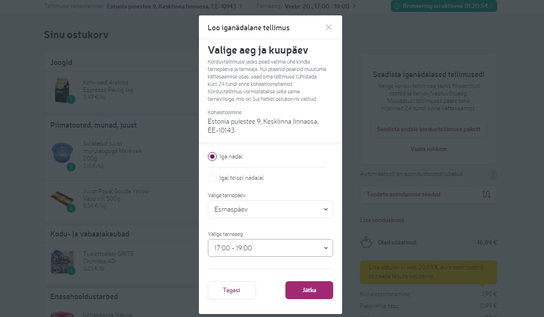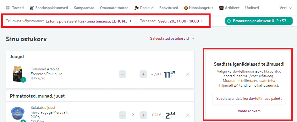 Seadistades endale korduvtellimuse paketi, saad kokku panna kindla ostukorvi, valida kindla nädalapäeva ja ajavahemiku, millal soovid tellimust kätte hakata saama. Sul on võimalus vormistada korduvtellimus mõlema tarneviisiga - kas kulleriga või korjad kauba ise kaupluse väljastuspunktist peale.