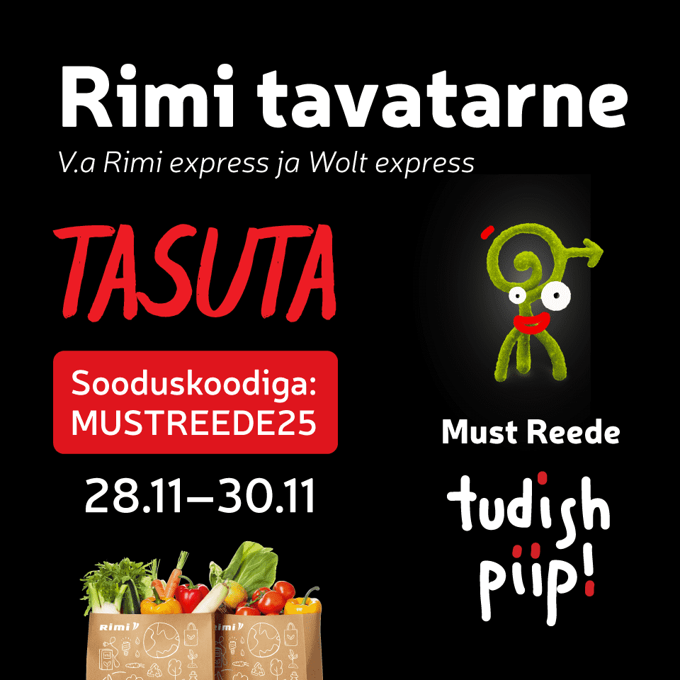 Rimi e‑pood pakub Musta Reede puhul tasuta kojutarnet. Soodustuse saamiseks kasuta sooduskoodi MUSTREEDE25 (sooduskoodi võib kasutada mitu korda).