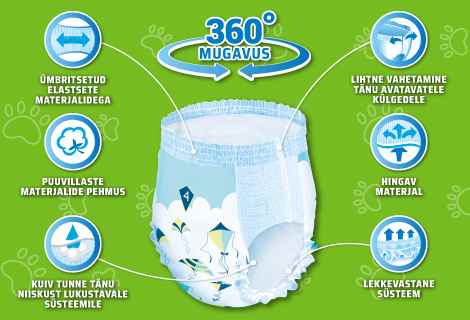 - Lihtne vahetamine tänu avatavatele külgedele – et lapsevanemal oleks mugav mähkmeid vahetada, on vaja püksmähkmete eemaldamiseks lihtsalt külg lahti rebida