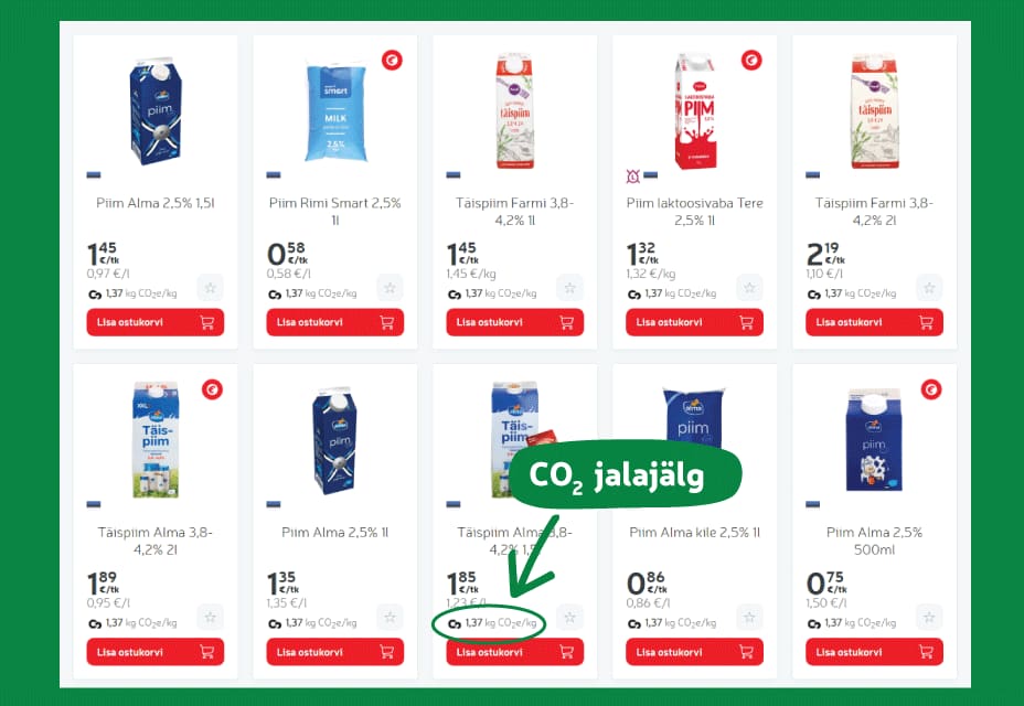 CO₂-jalajälje väärtused annavad teavet, mida vajate keskkonnasõbralikumate valikute tegemiseks. Sarnaselt toote suhkru- või rasvasisalduse kontrollimisega, saate nüüd teavet oma ostude CO₂-heite mõju kohta. See aitab teil teha säästvamaid valikuid.