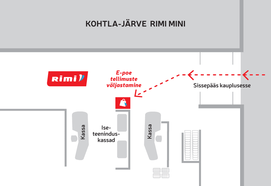 Sisene kauplusesse ja otsi kaardil viidatud väljastuspunkti asukoht. Tavaliselt asub väljastuspunkt iseteeninduskassade või infopunkti läheduses. Jälgi ka märke kaupluses sees (punased kuubid laes või kleebis klaasil).