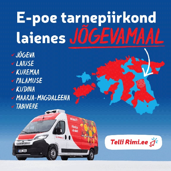 Vaata täpsemalt tarnepiirkondaSuurepärane uudis Jõgeva kandi rahvale! Laiendasime Rimi e-poe tarnepiirkonda Jõgevale ja nüüdsest toob kuller toidukauba koju ka järgmistesse asulatesse: Jõgeva, Laiuse, Saduküla, Kaarepere, Vanamõisa, Palamuse, Tabivere ja veel mitmetesse asulatesse.
