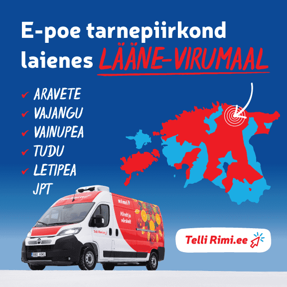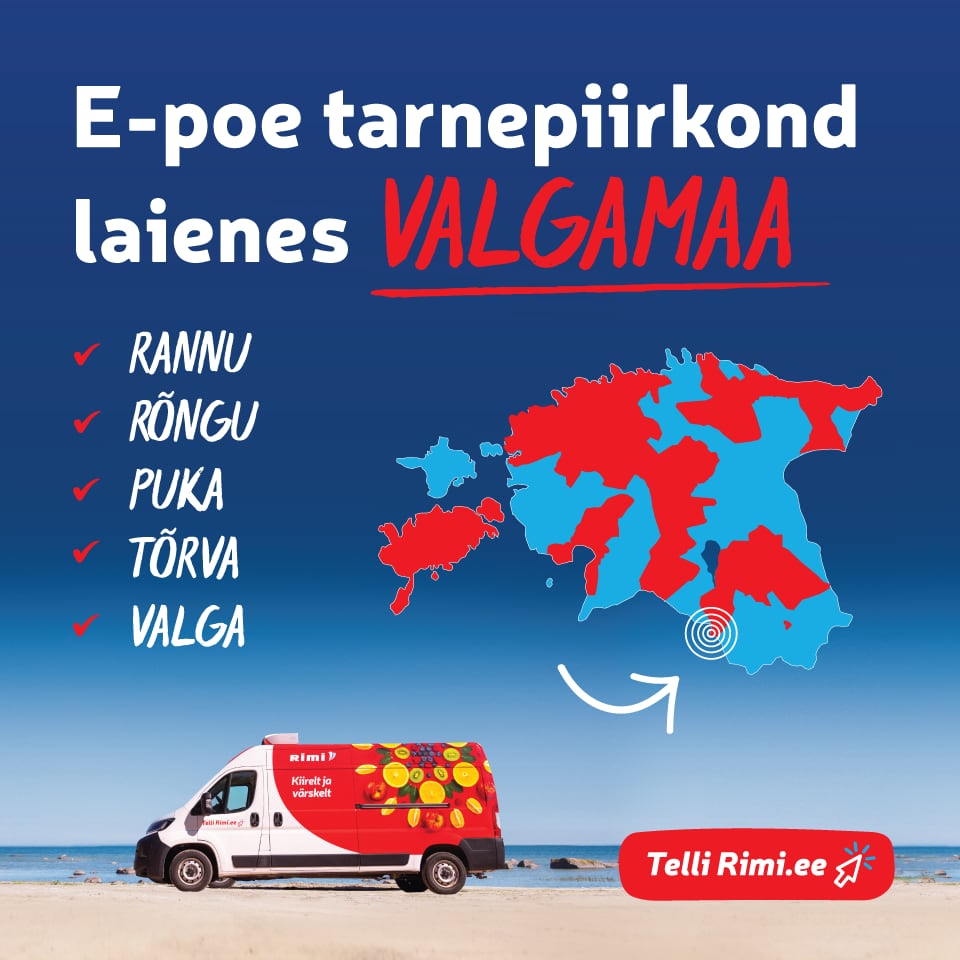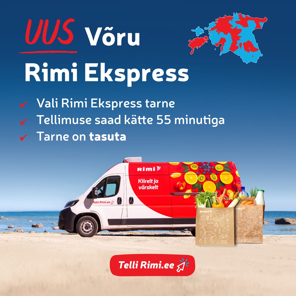 Vaata täpsemat tarnepiirkondaNüüd on Võru elanikel võimalus e-poe kaubad kätte saada juba 55-minutiga! Uue ekspress tarne avamise puhul on Rimi ekspress tarne Sulle 2,99! Vaata tarneaega valides, kas asud tarnepiirkonnad ja proovi uut ja mugavut võimalust juba täna!