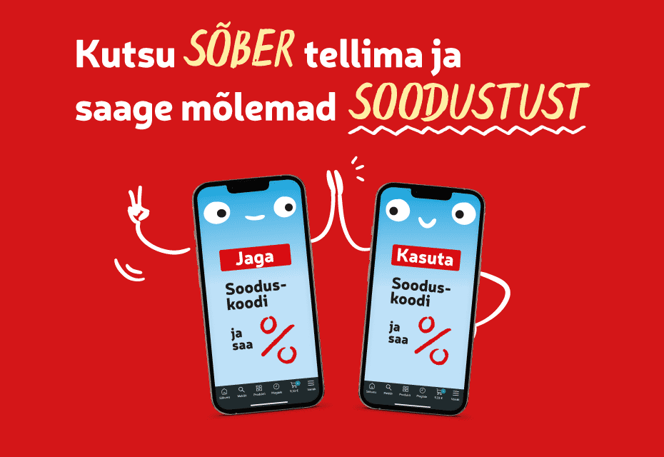 Kutsu oma sõbrad RIMI e-poest tellima, jagades neile enda unikaalset sooduskoodi, mis on leitav Sinu e-poe konto alt. Koodi abil saavad Sinu sõbrad oma esimeselt* e-poe ostult -20% allahindlust tavahindadega toodetelt!
