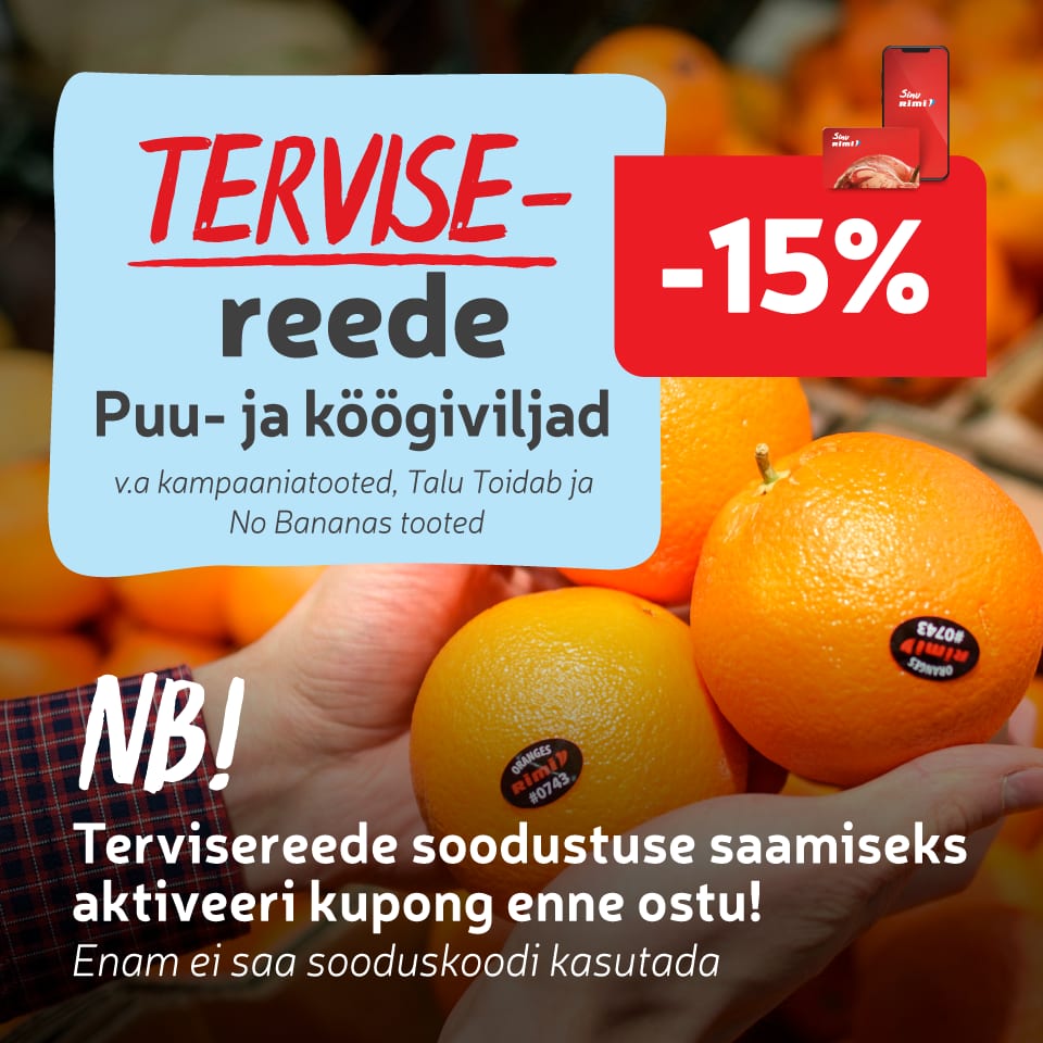Tervisereede soodustus annab iga reede -15% allahindlust kõigilt tavahinnaga puu- ja köögiviljadelt (v.a Talu Toidab ja No Bananas puu- ja köögiviljad).