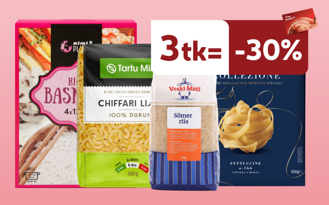 Perioodil 27.01.–02.02 on kõik makaronid ja riis Sinu Rimi kliendile -30% ostes vähemalt 3 selle kategooria toodet v.a kollase hinnasildiga tooted, Talu Toidab ja Rimi Smart.