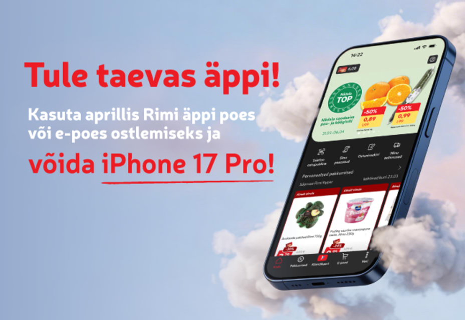 Lae aprillikuus alla Rimi äpp ja kasuta seda poes ostupuldina või e-poest ostlemiseks ning võid võita iPhone 17 Pro!
